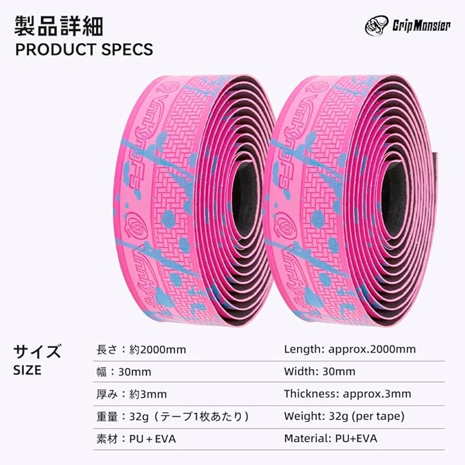 【商品仕様】 素材:強化PU+EVA サイズ:厚さ 3mm、長さ 2000mm、幅 30mm 付属品:バーテープ 2、バーエンドキャップ 2、バーエンドテープ 2 重量:約32g(1本あたり)