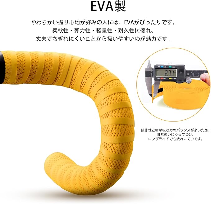 【衝撃吸収】厚みは2.7mmなので路面から受ける振動を緩和したり手への負担を軽減できます。操作性と衝撃吸収力のバランスがよいため、日常使いにうってつけ。適度なクッション性を持たせたバーテープは、ロングライドでも疲れにくいです。