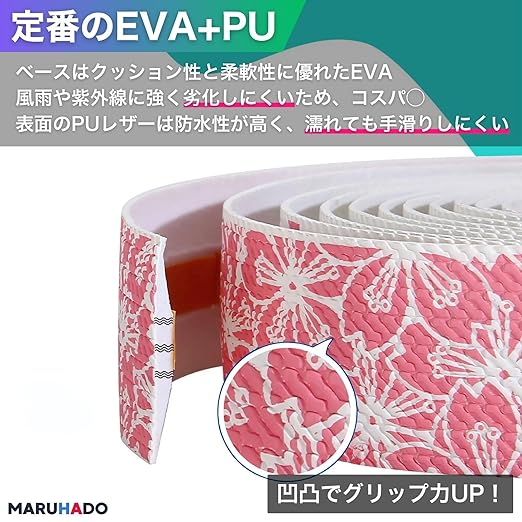 【高い汎用性】グリップ性が高く簡単に取り付けられるこのバーテープは、ロードバイク以外の自転車(マウンテンバイク、クロスバイクなど)にも対応可能。ベビーカーや釣り竿などにも使用できる優れた汎用性を持った万能アイテムとしても。和柄である桜模様のデザインなので、カラーによって明るく爽やか・かわいい・モダンでスタイリッシュ・デキる大人等の印象を与え、周りとひと味違ったユニークさを取り入れることができます。