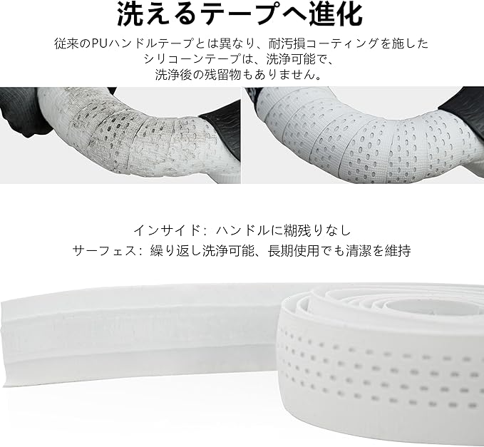 高耐久性バーテープ - シリコン粘着層がハンドルにしっかり固定。長時間使用しても緩まず、耐磨耗性に優れています。必要に応じて、バーを傷つけずにきれいに剥がすことができます。