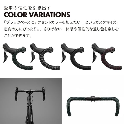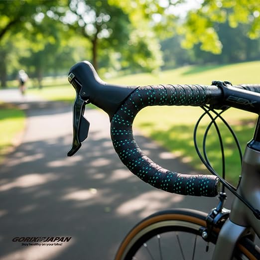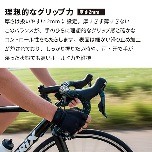 バーテープの交換は、愛車のリフレッシュと気分転換に最適! ロードバイクの乗り心地とコントロール性を劇的に向上させる、PUレザー(エコレザー)とEVA素材の2層構造バーテープが登場! 「少し厚めのものが欲しい」「手が疲れにくいものがいい」というユーザーの声に応え、厚さ2mmに設計。 この厚みが理想的なグリップと高いコントロール性を実現します。 表面にはしっかりとした滑り止め加工を施し、汗や振動による滑りを防止。 さらに、モチモチとしたEVA素材が、路面からの微振動や衝撃を効果的に吸収し、ロングライドでの手の疲労を軽減します。 カラーは、ブラックベースにチェレステやグレーといった人気色がちらりと覗くデザイン。 シックな装いの中に、愛車の個性をさりげなく主張できるカスタマイズに最適なバーテープです。