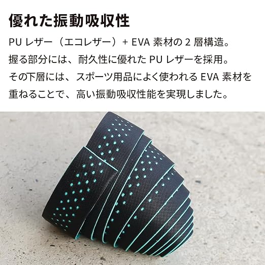 【優れた振動吸収性】 PUレザー(エコレザー)+ EVA素材の2層構造。 握る部分には、耐久性に優れたPUレザーを採用。 その下層には、スポーツ用品によく使われるEVA素材を重ねることで、高い振動吸収性能を実現しました。 このモチモチとした素材感が、路面からの衝撃を和らげ、特に手が疲れやすいロングライドで大きな効果を発揮します。
