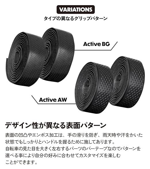 【デザイン性が異なる表面パターン】 表面の凹凸やエンボス加工は、手の滑りを防ぎ、雨天時や汗をかいた状態でもしっかりとハンドルを握るために施してあります。 また自転車の見た目を大きく左右するパーツのバーテープなのでパターンを選べる事により自分の好みに合わせてカスタマイズを楽しむことができます。