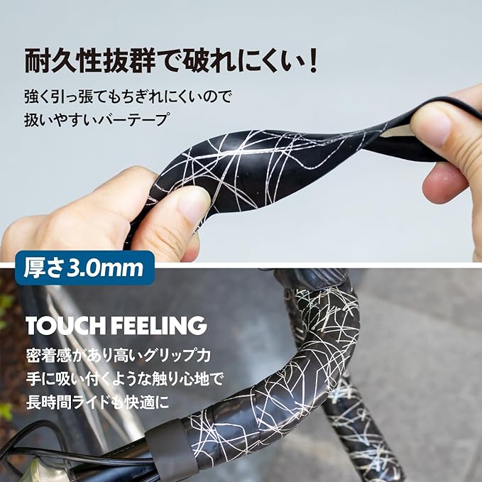 [厚さ3.0mm] 厚さ3.0mmで少し厚いタイプ、操作性と衝撃吸収力は高いコントロール性を発揮 巻いた感じは以外とごつごつしないです。厚い分悪路や砂利道、段差が多い道でもしっかりと衝撃を緩和します。