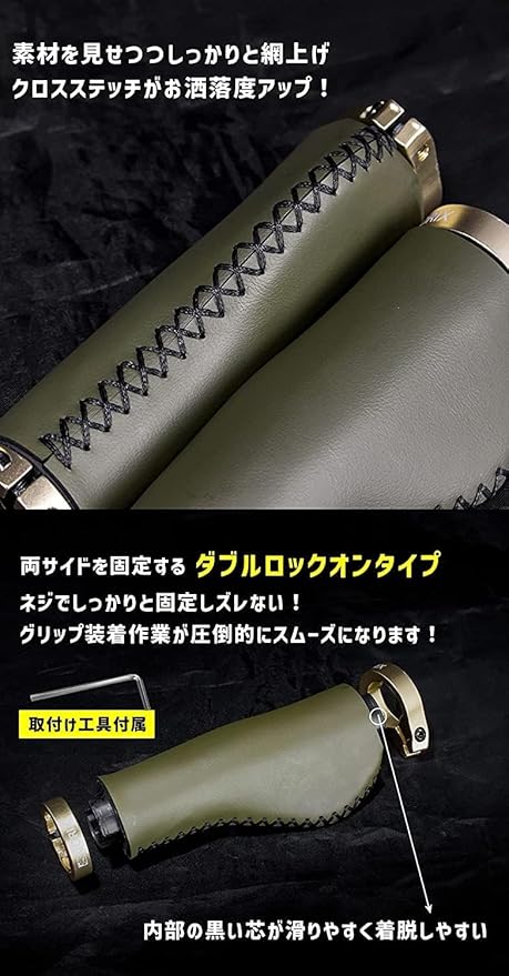 【商品内容】:自転車グリップ、エンドキャップ、取付け六角工具【サイズ】:長さ138mm【材質】:マイクロファイバー【正味重量】:約180g(ペア)【カラー】:オリーブ
