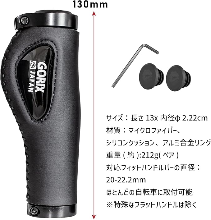 【商品内容】:自転車グリップ、エンドキャプ、六角レンチ【サイズ】:長さ13x内径φ2.22cm【材質】:マイクロファイバー、シリコンクッション、アルミ合金リング【重量(約)】:212g(ペア)【対応フィットハンドルバーの直径】:20-22.2mm