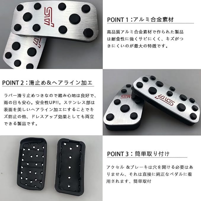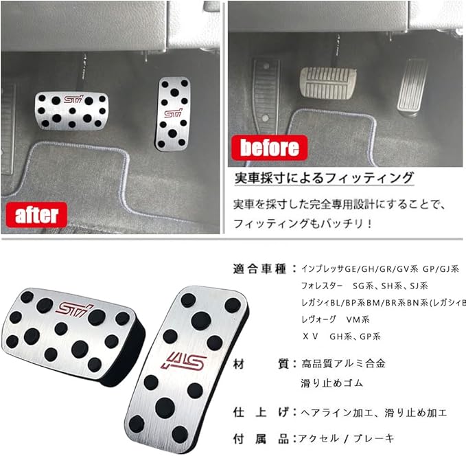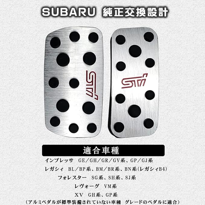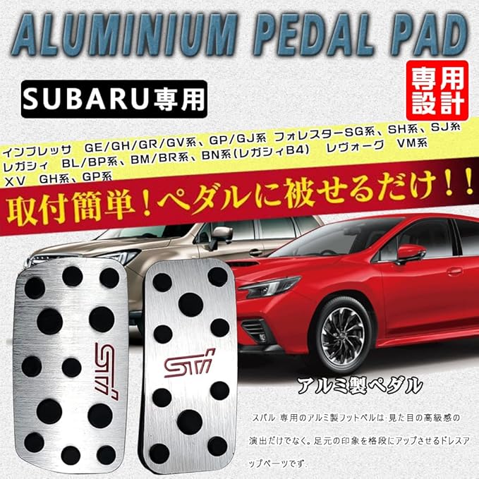適合車種:スバル オートマ用 インプレッサ GE/GH/GR/GV系 GP/GJ系 フォレスター SG系 SH系 SJ系 レガシィBL/BP系 BM/BR系 BN系(レガシィB4) レヴォーグ VM系 XV GH系 GP系(アルミペダルが標準装備されていない車種グレードのペダルに適合)。 4色の選択(赤/青/銀/黒)