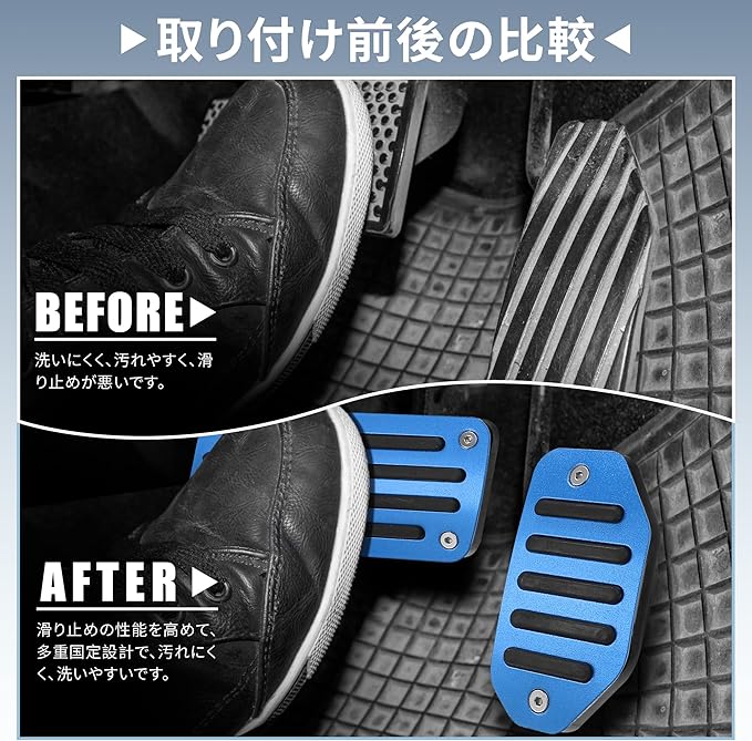 【取付簡単】:工具は必要ありません。既存のゴムを外してペダルカバーを取り付けます(ブレーキペダルのみ)。