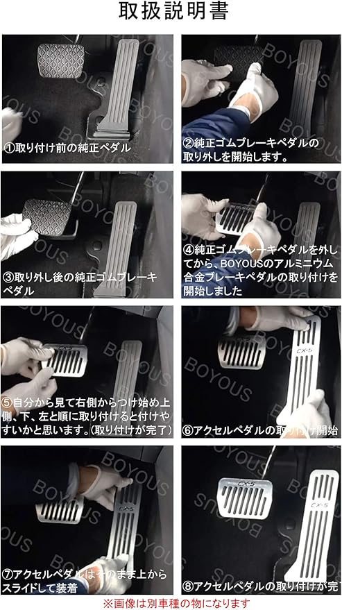 セット内容は、アクセルペダルカバー、ブレーキペダルカバー、取り付け説明書です。