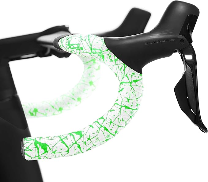 Supacaz Bartape - スーパースティッキークッシュ - スプラット - リミテッド- ホワイト/ネオングリーン + ブラックスタープラグ - サイクリングハンドルバーテープ | KAZESHOP