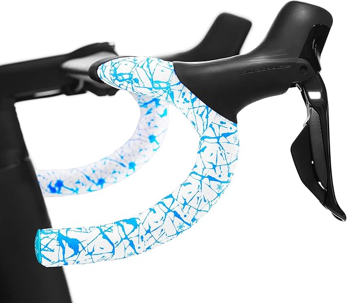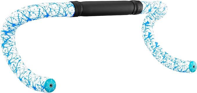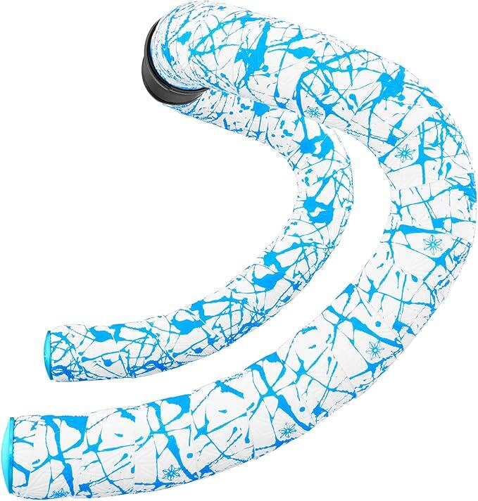 Supacaz (スパカズ) サイクリング バーテープ - Super Sticky Kush - Splat - Limited - White w/Neon Blue + Neon Blue Star Plugz | KAZESHOP