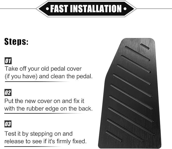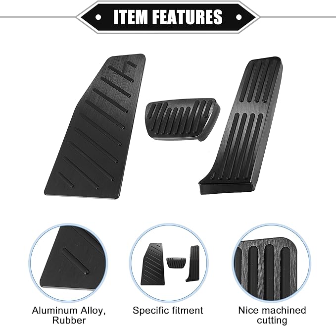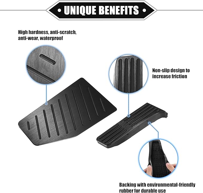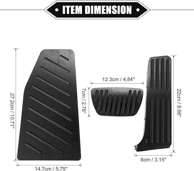特別な機能 - ガスペダルカバーはアルミニウム合金とゴム素材でできており、滑りにくく、ドリルは不要です。 トランスミッション:オートマチック。 ガスペダルカバーサイズ: 22x8x3cm / 8.66"x3.15"x1.18"(L*W*H)、ブレーキペダルカバーサイズ: 12.3x7x3cm / 4.84"x2.76"x1.18"(L*W*H) 、フットレストペダルカバーのサイズ:27.2x14.7cm / 10.71"x5.79"(L*W)。