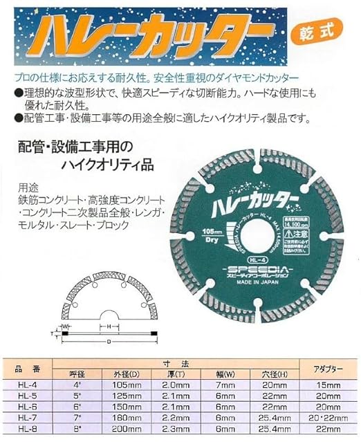 ◇プロの使用にお応えする耐久性と切れ味のダイヤモンドブレード。 ◇理想的な波型形状で、快適スピーディな切断能力。ハードな使用にも優れた耐久性。 ◇鉄筋コンクリート、配管・設備工事の他、ブロック、レンガ等外構工事等の用途全般に幅広く使用できます。 ◇用途:鉄筋コンクリート・高強度コンクリート・コンクリート二次製品全般・レンガ・モルタル・スレート・ブロック ◇寸法:呼径:6、外径:150mm、厚み:2.1mm、幅:6mm、穴径:22mm、 アダプター:20mm ◇適用工具:ディスクグラインダー、電動カッター、