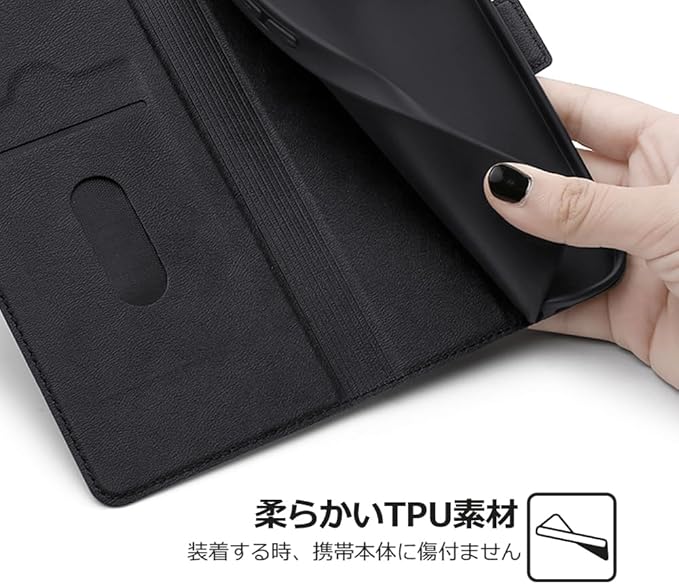【素材】:軽量化デザインの薄型ケースです。マットの炭素繊維調のPUレザーを採用し、指紋防止の特徴を持って、汚れにくくて触感が優しい素材です。インナーケースは柔軟なTPUホルダーです、装着が簡単で本体を傷つける心配はありません。衝撃吸収機能も良くて、しっかりと端末を守り抜きます。