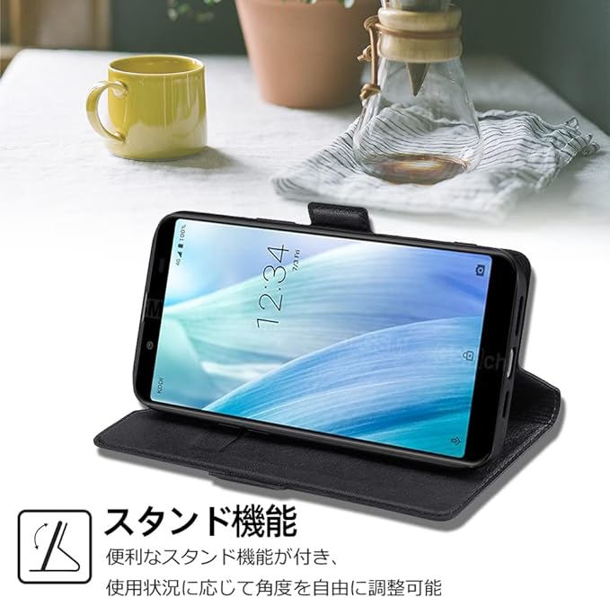 【特徴2】:スマホを横置きにしての視聴は不可欠なので、本ケースはスタンド機能が付きます。横向いて斜めに立てて両手を解放し、お気軽に読書やビデオの観賞を楽しむことができます。