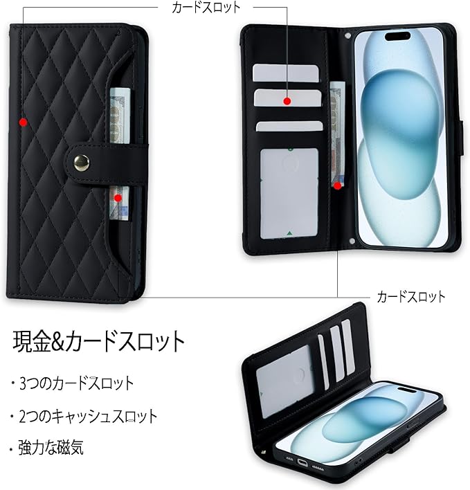 カード収納:Googleピクセル9a ケース 手帳型 ショルダー の内部には3つのカードスロットと1つの空きポケットがあり、交通系カード、日常的に使う銀行カード、写真なども簡単に収納できます。前面はマグネットボタンでしっかりと閉じられるため、財布としても活用可能です。これにより、スマホだけを持って外出して買い物ができるようになります。さらに、ぐーくるぴくせる9a ケース 手帳型 キルティング は映画鑑賞やビデオ通話の際にスタンドとして折りたたむことができ、お好みの角度で動画視聴や読書などを楽しむことができます