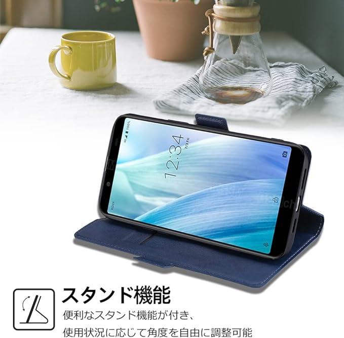 【特徴2】:スマホを横置きにしての視聴は不可欠なので、本ケースはスタンド機能が付きます。横向いて斜めに立てて両手を解放し、お気軽に読書やビデオの観賞を楽しむことができます。