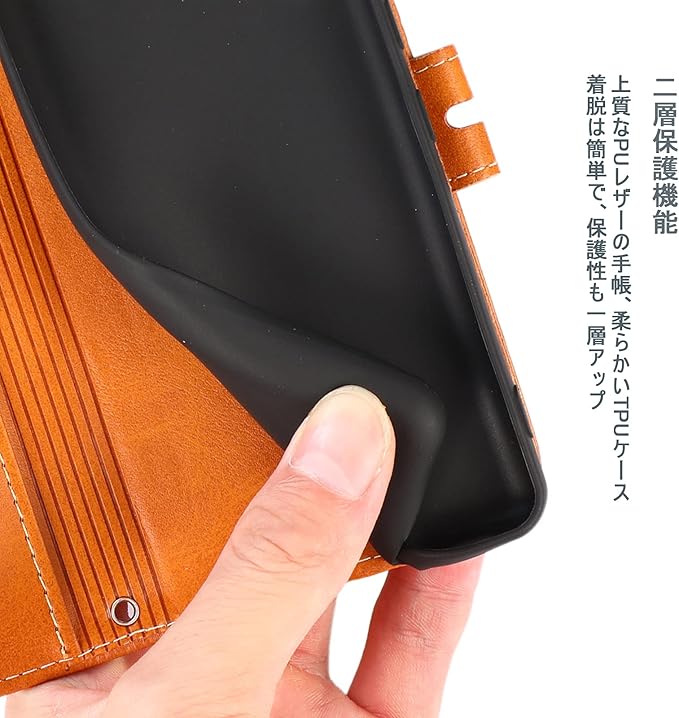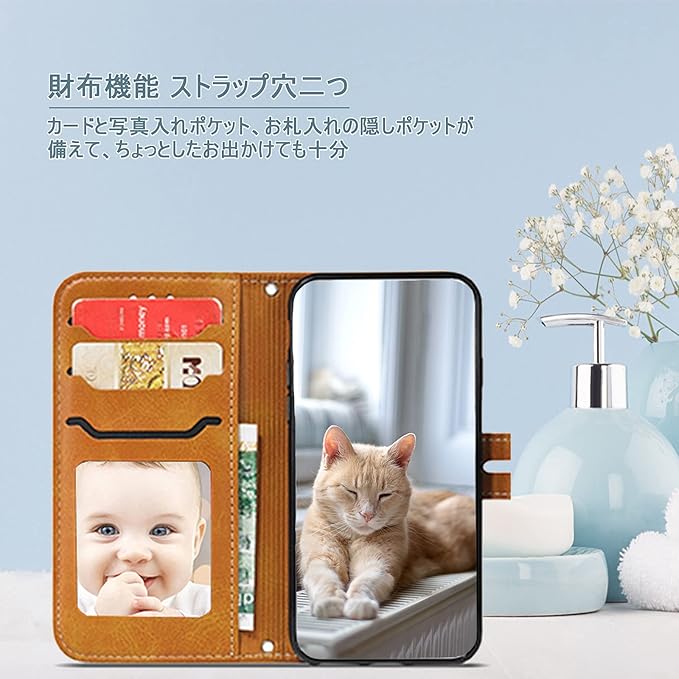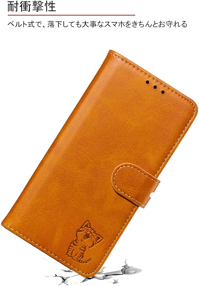 【素材:高級PUレザーとアップグレードしたTPUケース】本製品は厳選されたPUレザーを採用し、エンボスの猫柄が特徴です。レザー自体が水分をはずみ、汚れやシミが付きにくい仕様です。肌触りのような感じで、手汗が出てきても滑りにくいです。インナーケースは弾力あるTPU製で、ケースの一番右したのところにストラップホールもあり、お好きな小物とかお付けられます。柔らかく耐衝撃が強くなり、着脱もスムーズで、不意な落下からスマホをしっかりお守れます。