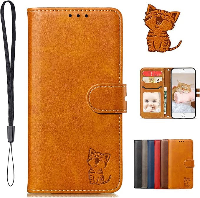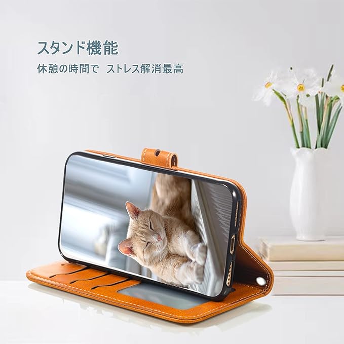 【ユニークなデザイン】シンプルながらも機能性も備わったデザインです。型押しの可愛い猫のモチーフと上品なレザーの組み合わせるケースであり、それに上下に二つのストラップ穴もあり、お好きなタッセルとストラップとかお付けられます、簡単こそクラッシクの上品を引き出せる、手作りの高級感ある色合いでちょっぴり大人なスマホケース。学生にも相応できるし、ワンポイントは笑顔猫であり、この手帳型ケースをギフトとしても最適です。