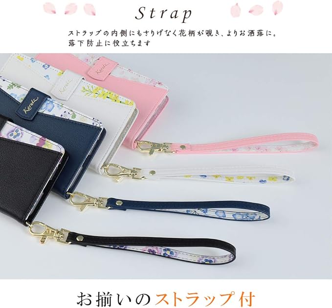 カード収納、動画視聴に便利なスタンド機能あり。ストラップ付