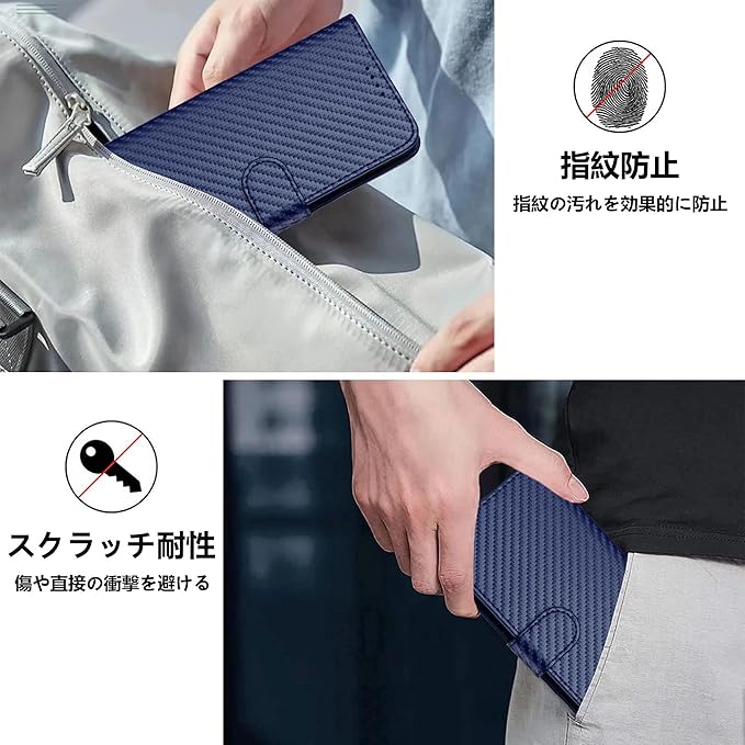 【上質な素材】このケースの外装は高品質のPU素材とカーボンファイバーの質感で作られており、手に馴染み、傷防止、指紋防止、優れた熱と衝撃吸収性を持っています。内側はソフトなTPU素材で携帯電話を保護し、着脱も簡単です。また、ケースは携帯電話を360 保護し、カメラレンズはスクリーンより少し高い位置に設計され、全周を覆っているため、あらゆる角度からの落下に対する安全性を高めています。