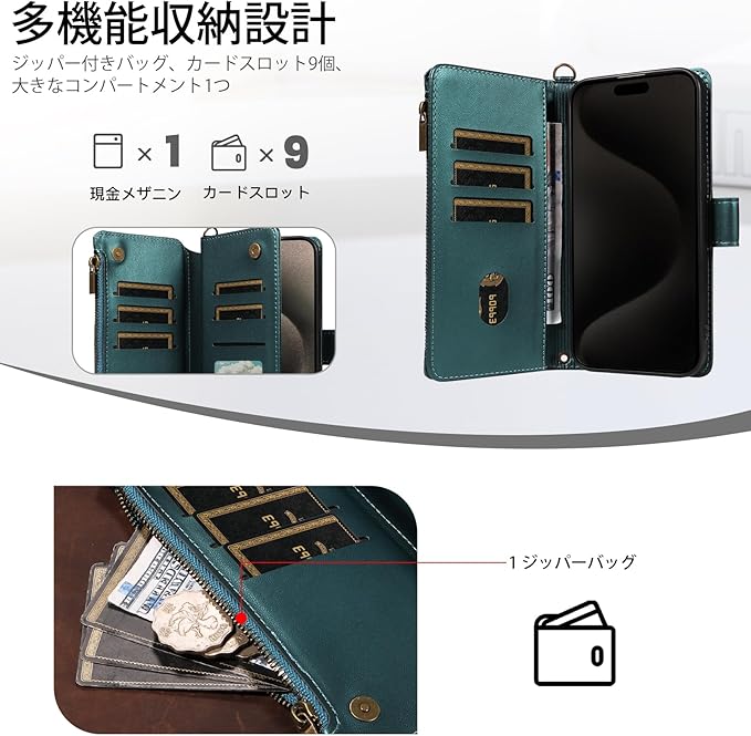 収納力:最大9枚のカード+紙幣・小銭を分別収納。透明ウィンドウ付きスロットは写真やよく使うカードを「見える化」し、スムーズな取り出しを実現。ファスナー付きポケットで貴重品も安心です。
