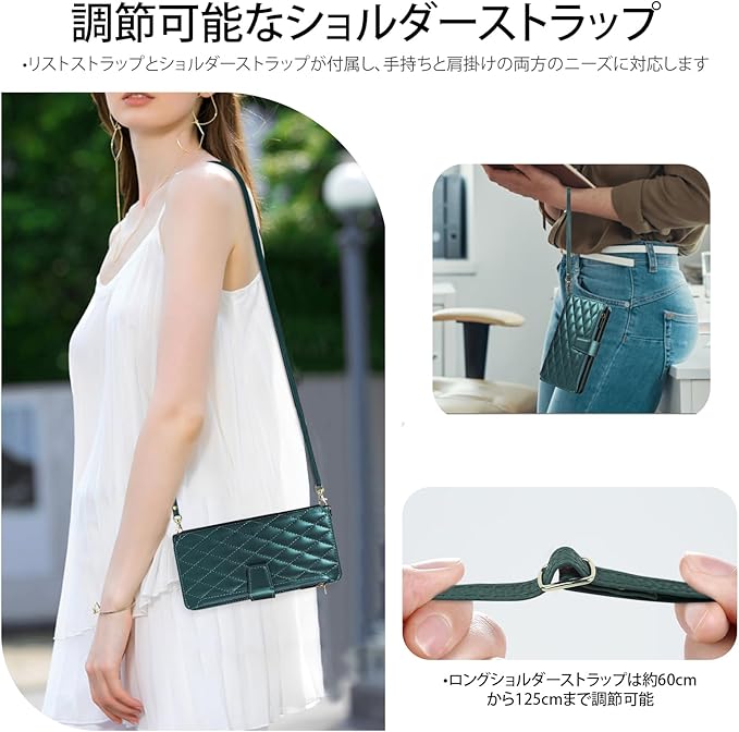 ストラップ2WAY:ロングストラップは肩掛けや斜めがけに、ショートストラップは手首に巻いて使用可能。