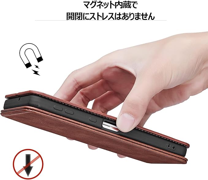 ★【360全面保護】・耐久性よくTPU素材を使用し、衝撃に耐える強いフレームを作りました。携帯に2重保護を与えて、かすり傷などの防止も役に立ちます。・マグネット式のフリップにより、カバーをしっかり固定することができます、カードの落としを防ぎます。・RFID 磁気スキミング防止、内部にはRFID対応の防犯層が備わっており、カード情報の保護に役立ちます。