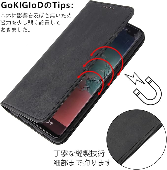 【機能性②】:マグネット内蔵のタイプです、使用上、指への支障も無くなって、一見からするととてもシンプルな感じがします。精密な縫製技術を重ねて出来上がった手帳型で、二重カバーのデザインにより、大切な携帯をキズ、汚れ、衝撃からしっかりと保護できます。