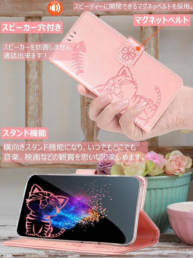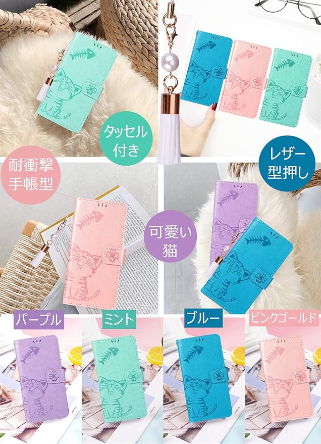 ● ネコがとってもキュート!かわいいレザー型押し手帳型ケースです。 タッセル付き、楽しい気持ちになる可愛い猫柄スマホケースです。☆あなたのお気に入りデザインで、スマホケースからオシャレしましょう☆手に馴染みやすく、耐久性も定評のあるフェイクレザー素材を使用。