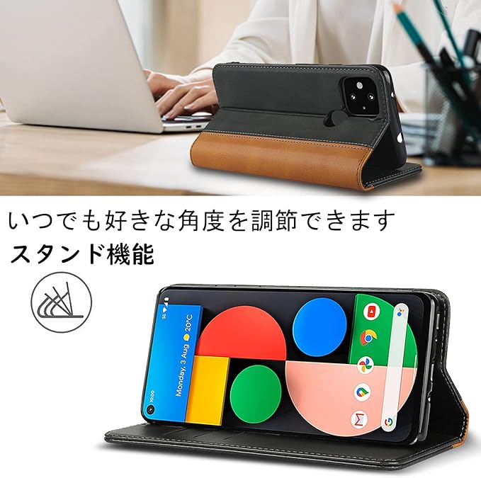 【収納機能】Google Pixel 4A 5Gケース内側には三つのカード入れとフリーポケットがつき、カード類や紙幣、名刺などが収納できます。カードスロットに2枚のカードを入れると、内蔵マグネットの機能を最大限に発揮し、カードが消磁されるのを防ぐことができます。横置きスタンド機能が付き、横向いて斜めに立てて、自由に角度を調整して、お好みの角度で動画鑑賞や読書などを楽しめます。長時間での新幹線、飛行機の中での暇つぶしに最適です。