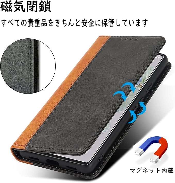 【マグネット式】内蔵マグネットの手帳型ケースです。カバーに使われているマグネット式の設計により、スマートフォンをしっかり固定できます。閉じたときにも電話の音は聞こえるので、持ち運びも簡単で使い勝手がよいです。お年寄りやお友達へのプレゼントにも最適です。