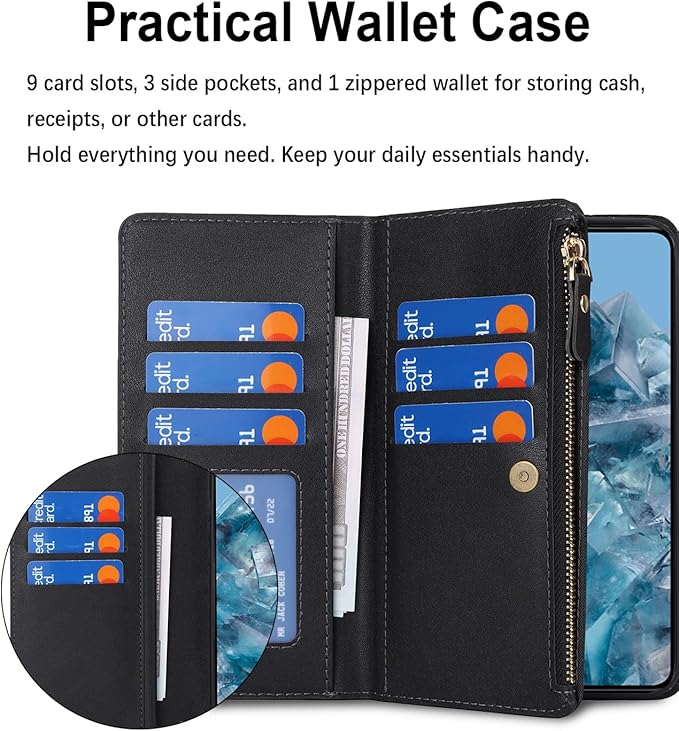 for Google Pixel 8 Pro ケース for pixel 8pro 縄掛けケース for Google Pixel8 Pro 手帳型 財布型 ICカード コインポケット ストラップ付き カード 収納 小銭入れ ファスナーポケット付き PUレザー 6色 ブラック