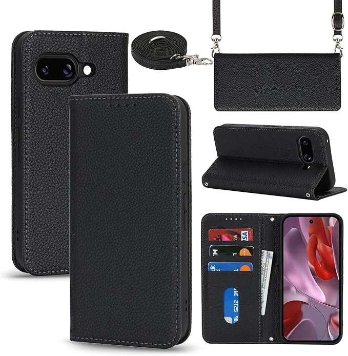 【Hamany】 対応 pixel 9A ケース ショルダー グーグルピクセル9A ケース 手帳型 スマホストラップ カード収納 財布型 スタンド機能 ピクセル9Aスマホケース マグネット式 女性 肩がけ 首掛け 斜め掛け ショルダーバッグ 携帯カバー -ブラック | KAZESHOP