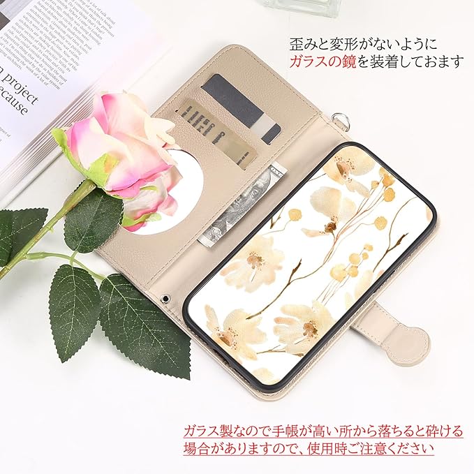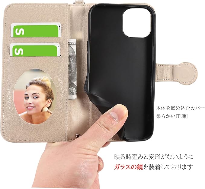 歪みと変形がないようにガラスの鏡を使用、ちょっとしたお化粧直しも便利です(高い所から落ちる場合は鏡が割ることがありますので、ご注意ください)。内側にカードポケットX2枚を入れ、さらに大きいサイドポケットも用意し、メモや小口の現金を挟み込めます。手帳型スマホケースをお持つだけお出かけに十分です。