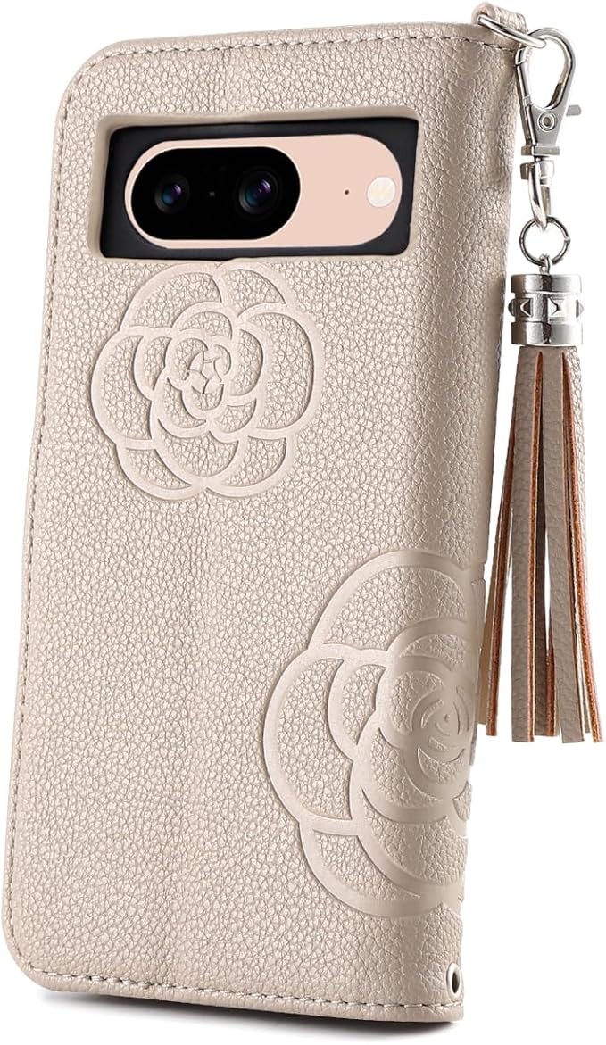 Google Pixel 8 手帳型 ケース 型押しのお花柄 シンプル 無地 ライチレザー ミラー付き タッセルチャーム付き Befortwo カメリアフラワー グーグル ピクセル8 手帳型スマホケース かわいいデザイン 女子 Pixel8 カバー 手帳型 カード入れ 対応 スタンド機能 落ち着いた色 ソフトな嵌め込みカバー キャメル | KAZESHOP
