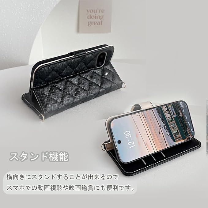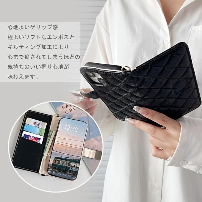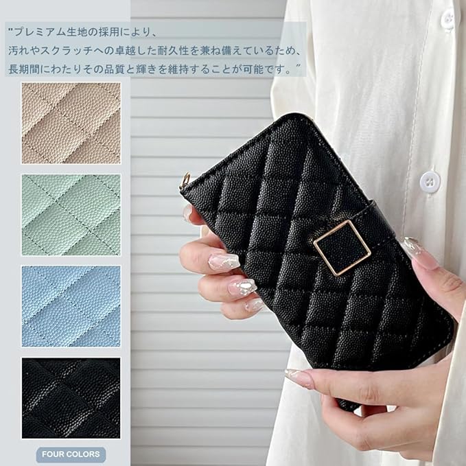 ✨【人気の理由】❶心地よいゲリップ感。程よいソフトなエンボスとキルティング加工により、心まで癒されてしまうほどの気持ちのいい握り心地が味わえます。❷手帳ケースの場合はカバーが画面を覆っているため、画面から直接地面に落ちる場合は、スマホの画面を保護してくれるので安心といったイメージがあります。❸ストラップ取付可、ケース下部分の金具にお好みのストラップを取り付けても。