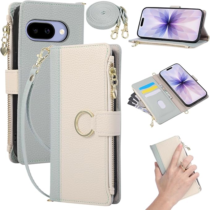 Google Pixel 9a ケース 手帳型 ショルダー グーグル ピクセル9a 用 ケース ストラップ付き Pixel9a スマホケース 6.3インチ 適用 Google Pixel 9a 手帳型ケース リング付き 携帯カバー マグネット式 ファスナー付き 小銭入れ カード収納 財布型 スタンド機能 肩掛け 斜め掛け おしゃれ (ホワイトブルー) | KAZESHOP