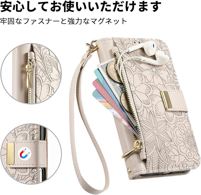 for Google Pixel 9a ケース 手帳型 グーグルピクセル9a ケース ショルダー ぐーくるぴくせる9a スマホケース 花柄 カード収納 pixel9a カバー 肩掛け googlepixel9a カバー 財布型 ジッパーポケット 女性向け 全面保護 耐衝撃 スタンド機能 型押し はな柄 かわいい - オフホワイト | KAZESHOP