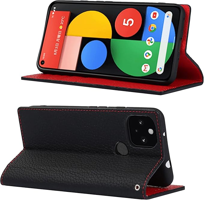 for Google Pixel 5A 5G ケース 本革 本革 for pixel5a 5g 手帳型ケース 財布型 カバー 手帳式 本革 柔らかい 本皮 スプラットホール付き スプラット同梱 内蔵マグネットカード収納 横置きスタンド機能 - ブラック