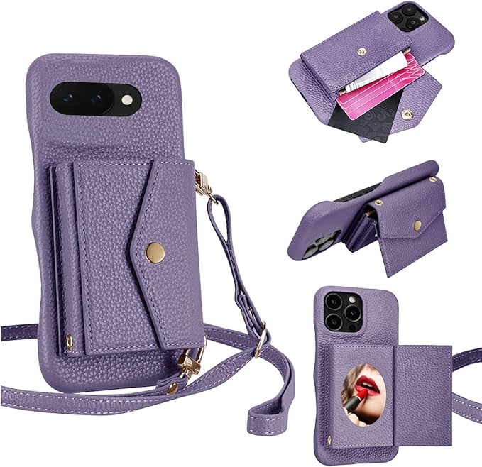 For Google Pixel 9A ケース 手帳型 背面 カード For グーグル ピクセル 9A ショルダー ミニメイクミラー付き 背面カード収納 スタンド機能 PUレザー 横+縦 2掛け方 調整可能ショルダーベルト 耐衝撃 おしゃれ 財布型 パープル | KAZESHOP
