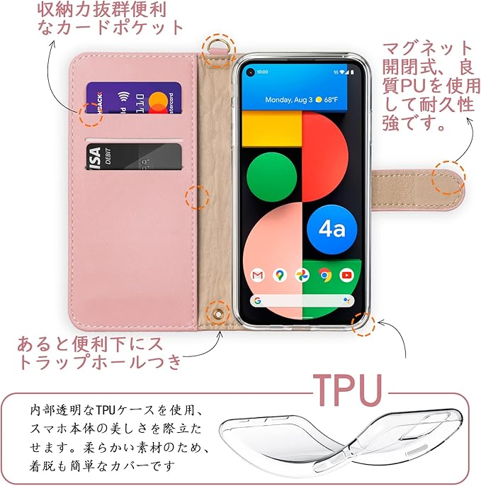 【対応機種】Google Pixel 4a 5G専用全面保護スマホケース(Pixel 4aモデル非対応)。 素材:高品質のPUレザー+柔らかく透明なTPUカバーと組み合わせ、衝撃吸収機能あり、しっかりの二重保護でお携帯を守り抜きます。