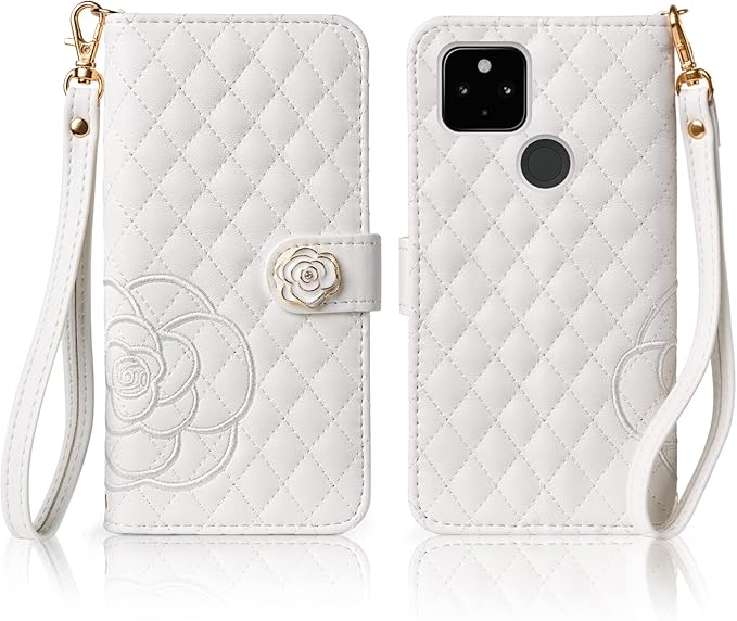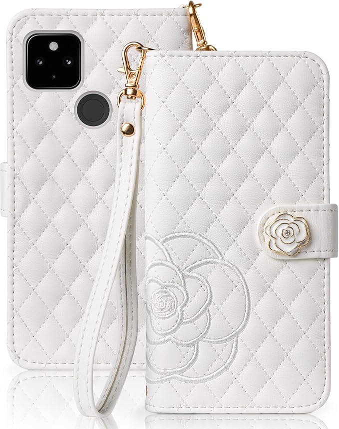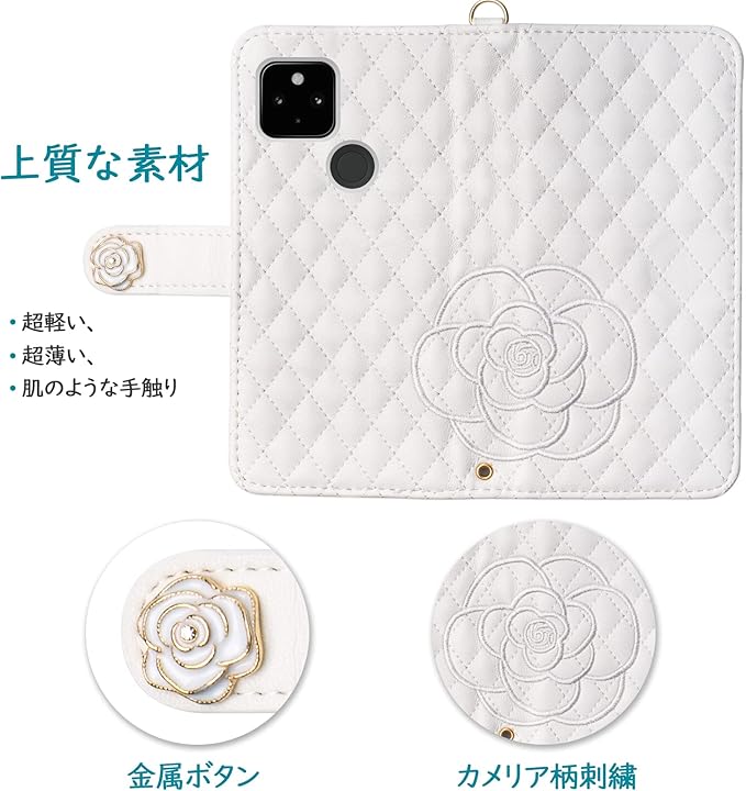 SZJAMIE Google Pixel 4a 5G ケース 手帳型 Pixel 4a 5G 手帳型ケース 薔薇刺繍 おしゃれ カメリア花柄 グーグル ピクセル 4a 5G スマホケース 女性向け 上品 高級レザー 軽量 可愛い 手触り 耐衝撃 カード収納 財布型 横置きスタンド機能 全面保護 ストラップホール付き (Google Pixel 4a 5G 対応, ホワイト) | KAZESHOP