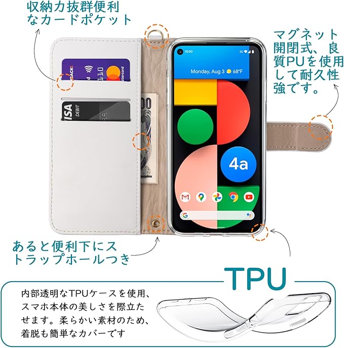 【対応機種】Google Pixel 4a 5G専用全面保護スマホケース(Pixel 4aモデル非対応)。 素材:高品質のPUレザー+柔らかく透明なTPUカバーと組み合わせ、衝撃吸収機能あり、しっかりの二重保護でお携帯を守り抜きます。