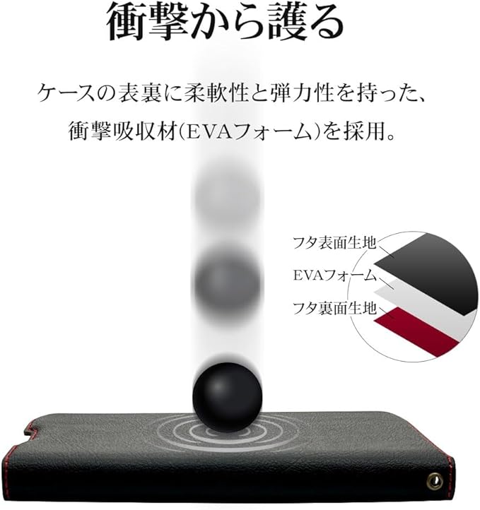 【衝撃吸収素材EVAフォーム採用】EVAフォーム(エバフォーム)とは、エチレン酢酸ビニル共重合体を主体とする樹脂素材の略称で、プラチックの一種です。EVAフォームは弾力があって柔らかいため、外からの衝撃に強いという性質があります。反発性弾性、復元性、耐候性、グリップ性に優れた素材です。※すべての衝撃から端末を保護できることを保証するものではありません。