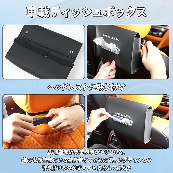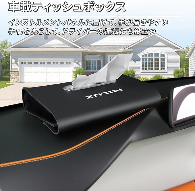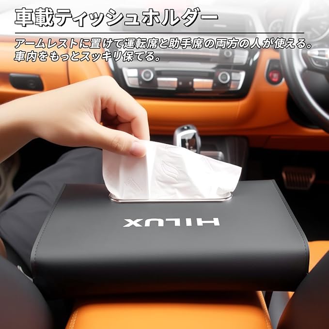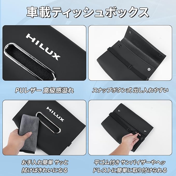 【専用ロゴこだわりの設計】この車用ティッシュケースはHILUX専用ロゴで、ご愛車に合わせやすい洗練なデザインが特徴です。 専用ロゴが印刷されており、高品質な PU レザーで作られているため、上品な質感を持ち、お手入れも簡単です。車内のインテリアとスタイルが完璧に調和し、お客様の個性的なニーズに応えます。車内でティッシュが散らかって収納が難しい問題を解決しつつ、車内の美しさと清潔さも向上させます。素材は柔らかく、触り心地が良く、ドライブ中に異音が発生したり、車内のインテリアに傷がつくのを防ぎます。お客様がより便利にティッシュを収納し、スムーズに取り出しできるように配慮されています。Hilux ハイラックス gun125 8代目 120系 対応車種に適合します。
