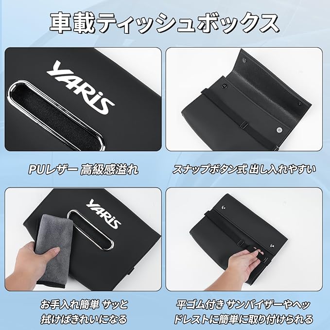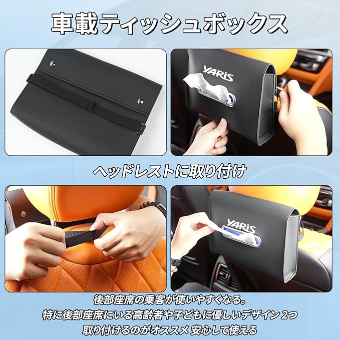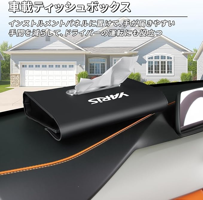 【合理的な設計】この車用ティッシュケースは YARiSロゴが印刷されており、高品質な PU レザーで作られているため、上品な質感を持ち、お手入れも簡単です。対応 ヤリス 新型 ヤリスYARiS X G Z 車内のインテリアとスタイルが完璧に調和し、お客様の個性的なニーズに応えます。車内でティッシュが散らかって収納が難しい問題を解決しつつ、車内の美しさと清潔さも向上させます。素材は柔らかく、触り心地が良く、ドライブ中に異音が発生したり、車内のインテリアに傷がつくのを防ぎます。お客様がより便利にティッシュを収納し、スムーズに取り出しできるように配慮されています。
