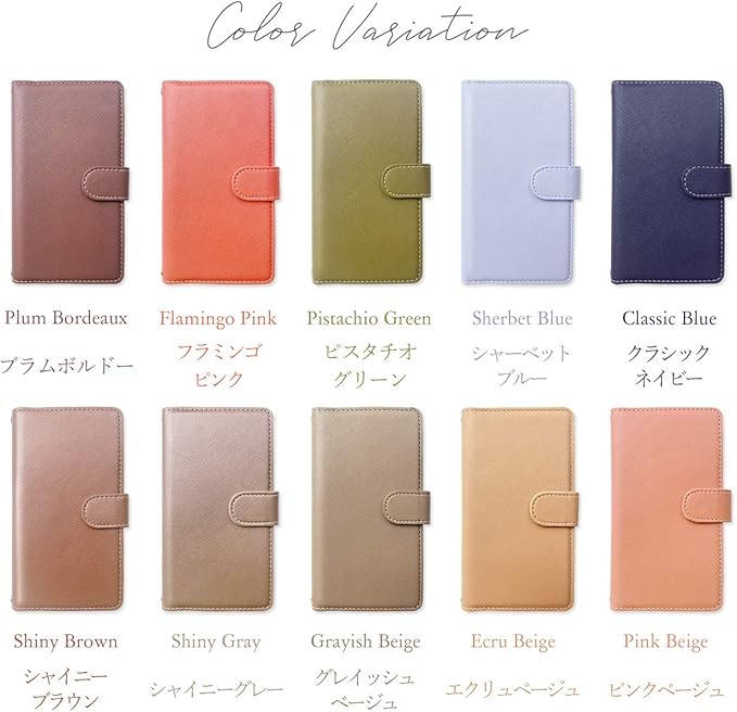 全面に サフィアーノ 風 型押し PUレザーを使用したシンプルで上品なデザインに、洗練されたニュアンスカラーでこなれ感を演出した手帳型ケースに仕上げました。