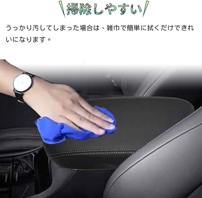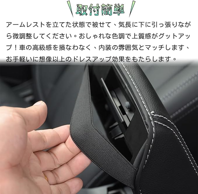 【車種専用・取付簡単】:車種専用の設計を採用し、実車の寸法データをもとに設計・製作を行い、元のアームレストとぴったりフィットするようにしています。取付けが簡単で手間がかからず、保護カバーの裏側にはゴムバンドがついており、アームレストを立てた状態で上から被せていいです。