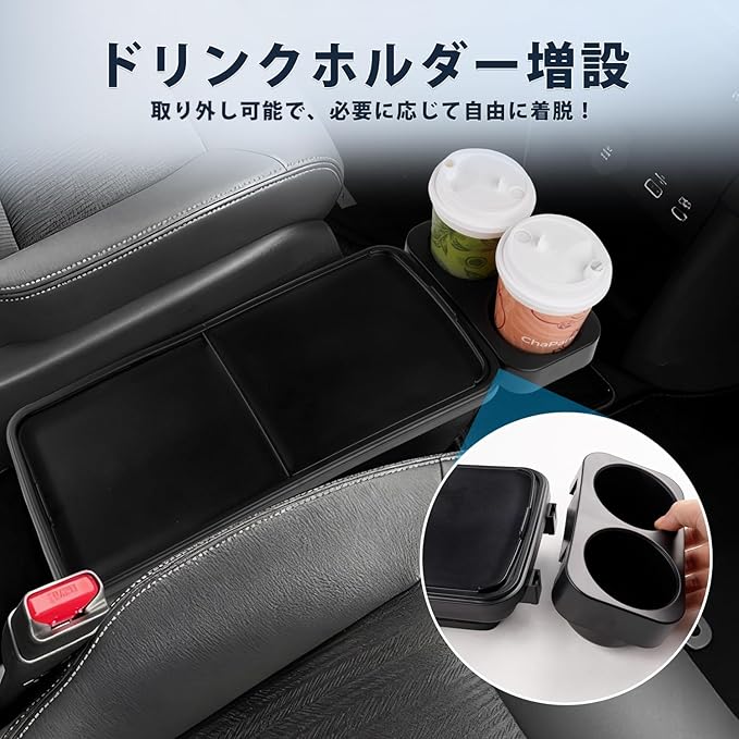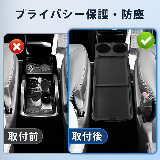 2.【プライバシー保護・防塵】:中央収納ボックスに置いたカードやコイン、鍵などの小物をサッと隠せる専用カバーです。さらに、ホコリやゴミの侵入を防ぐことで、収納スペースを清潔にキープ。必要な時はサッと開閉でき、利便性と高級感を兼ね備えたアイテムです。